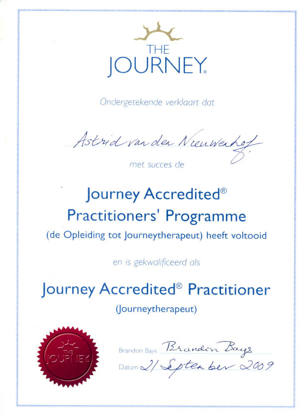 * Geaccrediteerd journey practitioner houdt in dat je na het beginnersweekend (de Journey Intensive), zeven seminars en retraites ondergaat. Elk van de zeven modules heeft een bijbehorend aantal casestudies met een totaal van minimaal 45. Een casestudie is een gegeven helende reis die je helemaal uit moet werken. Aan het eind van het programma worden deze beoordeeld en wanneer ze goed bevonden zijn word je toegevoegd aan de internationale lijst van Journey-practitioners.